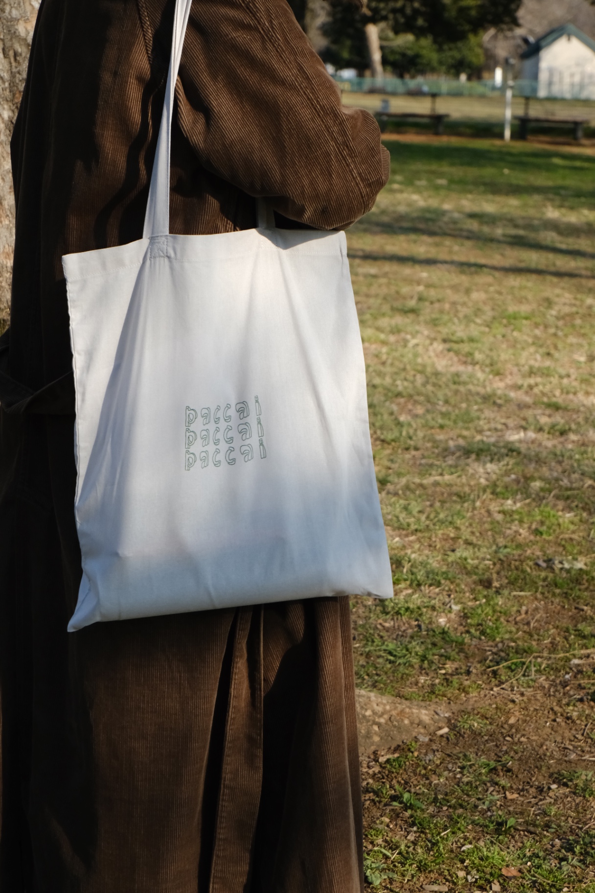 光があたって白っぽく見えますが、薄いやさしいグレー色にグリーンでロゴをプリントしました◎