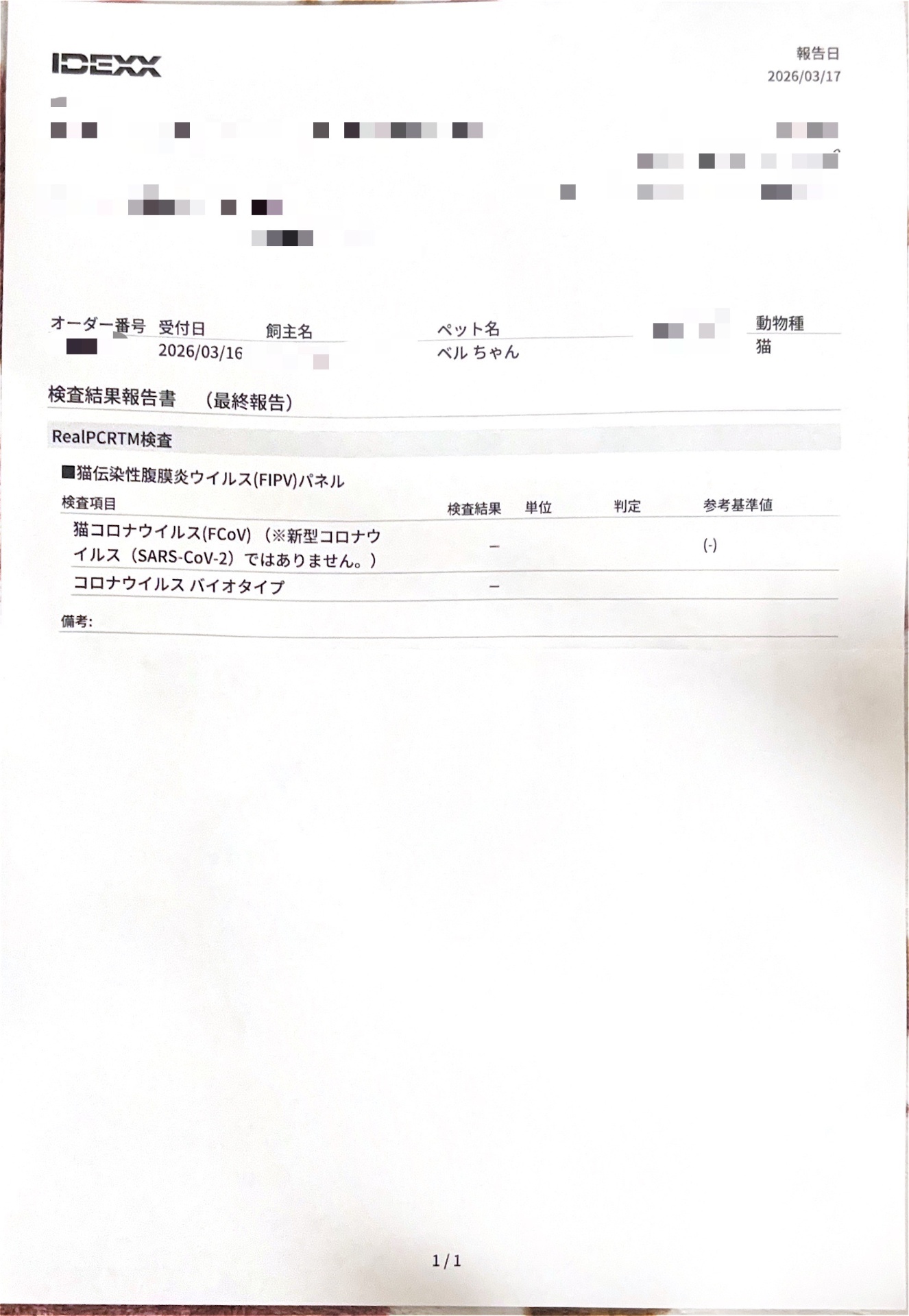 前回の活動報告でお伝えしましたが、脳脊髄液の検査結果については取り急ぎお電話でいただいていたので、結果報告書を書面でいただいてきました。