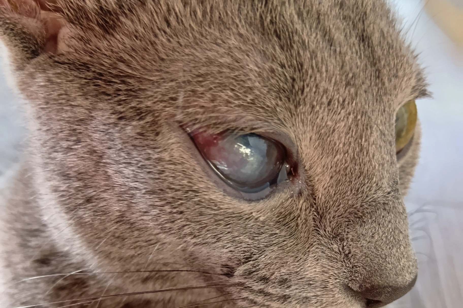 嫌いな点眼後はテンションが下がり大人しくなります。点眼薬も大切な治療なので朝・夕に行っています。まだ右眼は白く充血しています。