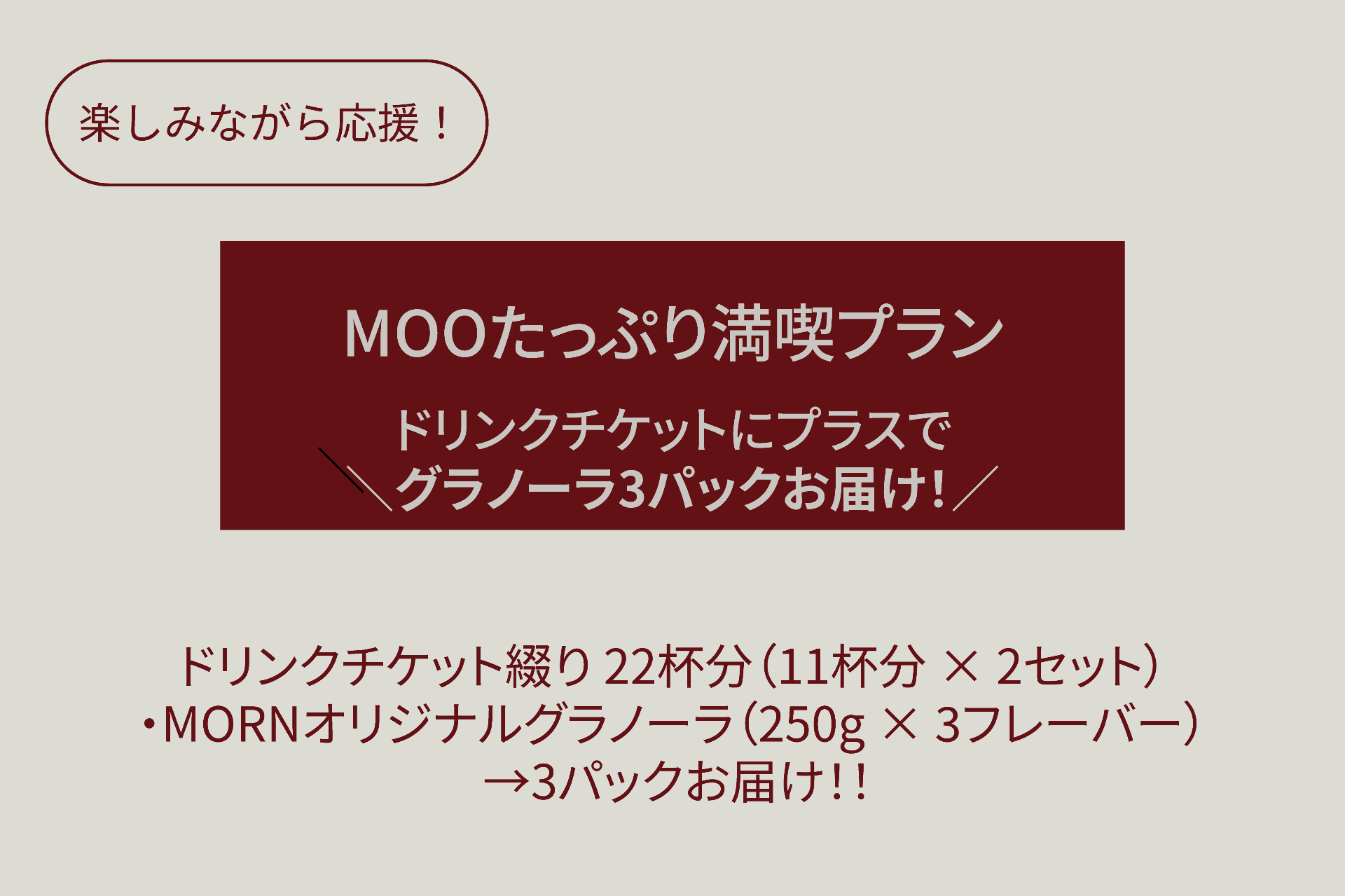 新しいMOOで使えるドリンクチケットに、POPPINの朝ブランド「MORN」のオリジナルグラノーラを「このプラン限定で《3パックお届け》」する特別プランです。