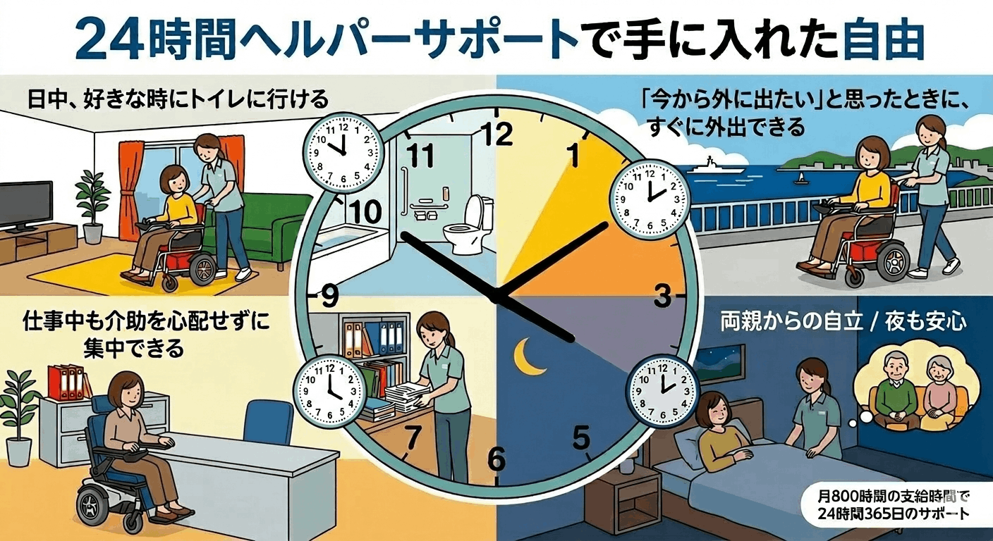 今回の制度導入に伴い、私の重度訪問介護の支給時間は「月800時間」にまで拡大されます。